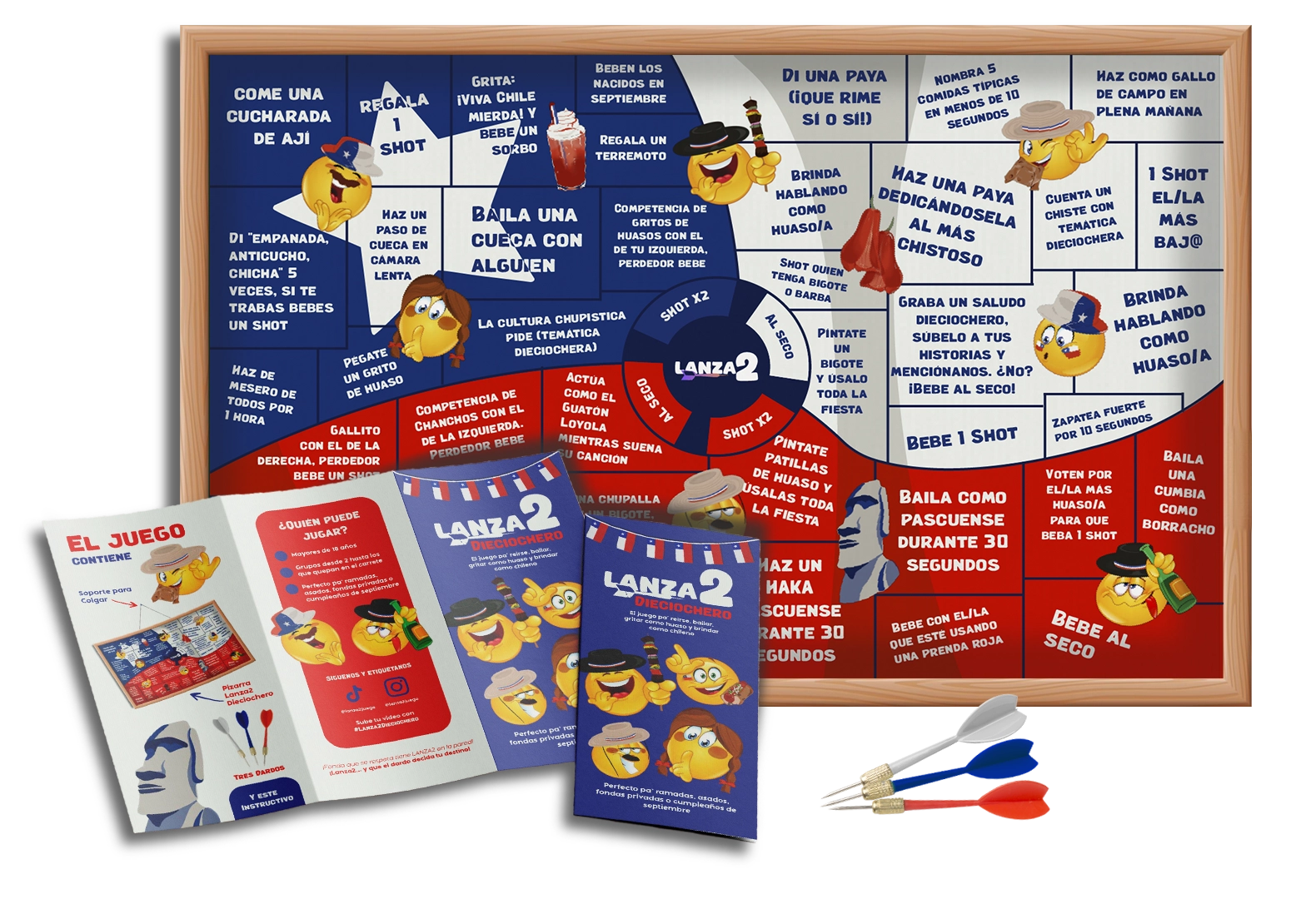Excelente juego, además muy buena calidad, ni se notan los hoyos de los dardos, ya jugamos el Lanza2 Carrete y lo hemos usado en hartos carretes y sigue intacto, tenemos lanza2 para rato y ahora el dieciochero! recomendable totalmente.